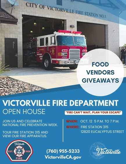 Victorville, California: The Victorville Fire Department will be celebrating National Fire Prevention Week by hosting an Open House at Fire Station 315 during the evening on Wednesday, October 12th, 2022.