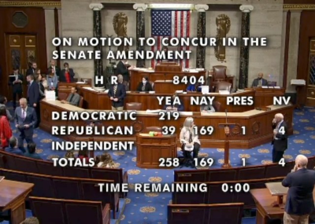 The United States House of Representatives vote was 258-169-1, and comes after the United States Senate passed the bill last week by a vote of 61-36.