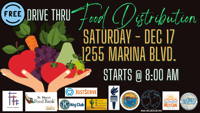 Bullhead City, Arizona: There will be a Free Drive-Thru Food Distribution being held near the Bullhead City Administration Complex located at 1255 Marina Boulevard during the morning on Saturday, December 17th, 2022.