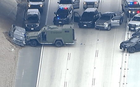 The police pursuit came to an end along southbound Interstate 15 just underneath the 5th Street overpass in Norco, California with the pickup truck up onto the shoulder of the freeway and was pinned on the embankment by a law enforcement bearcat.
